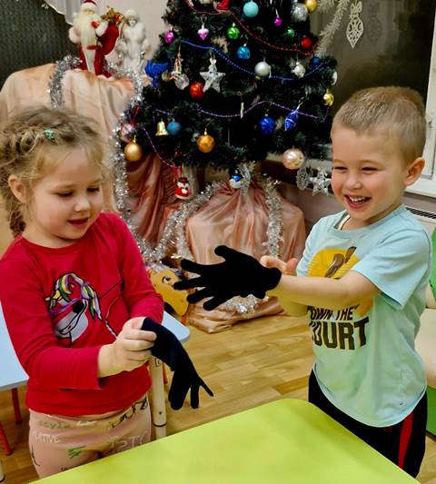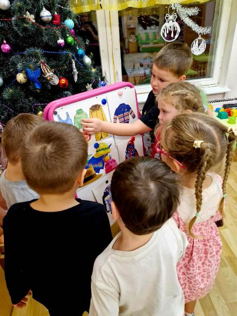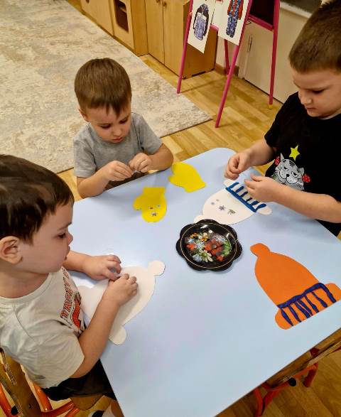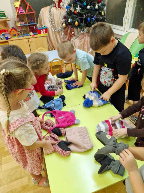 Первая игра была "Найди лишнее", ребята сами предлагали много вариантов этой игры и было очень интересно. Потом мы устроили соревнования, "Кто быстрее наденет перчатки!", "Кто быстрее застегнёт пуговицы", "Кто быстрее скрутит шарф"....