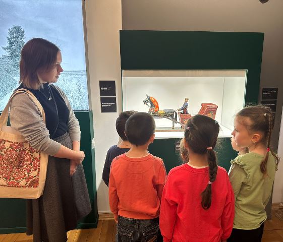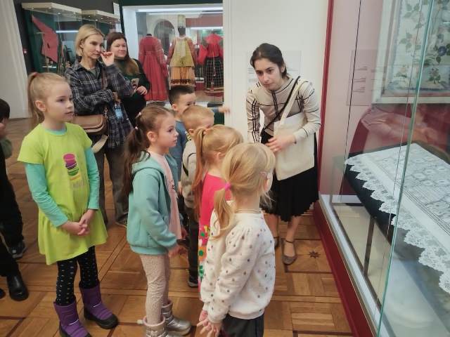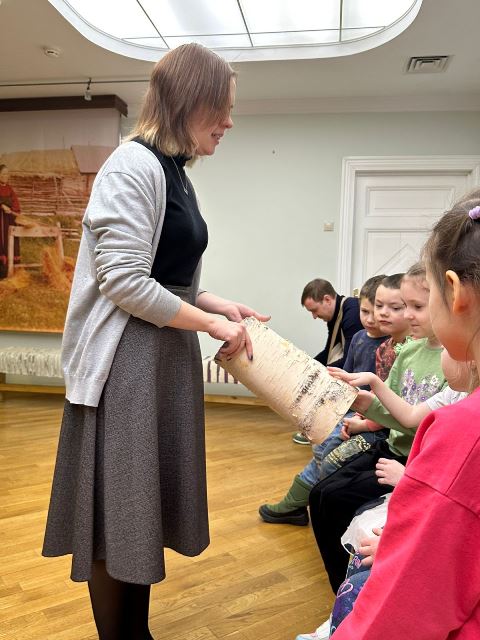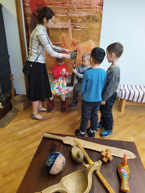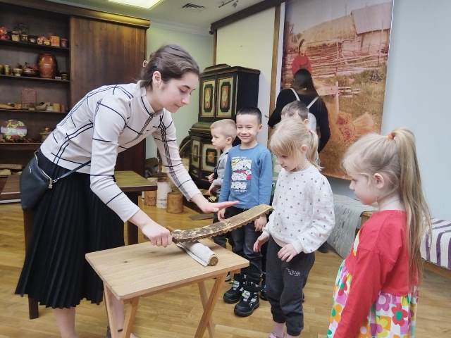 После знакомства с произведениями мастеров, в интерактивном пространстве дети смогли попробовать попрясть на прялке, погладить рубелем, подержать в руках расписные и резные солонки и погремушки из бересты.