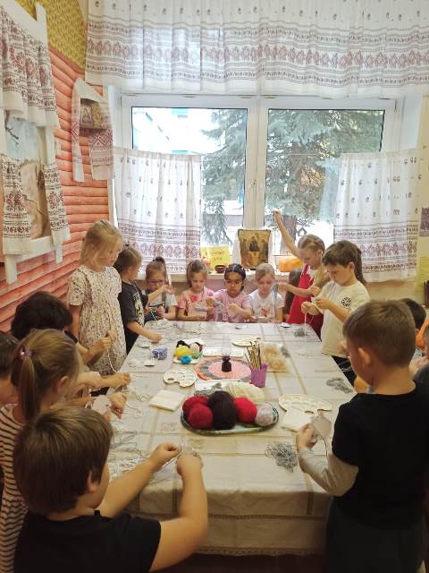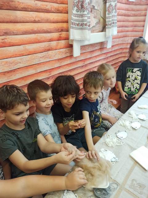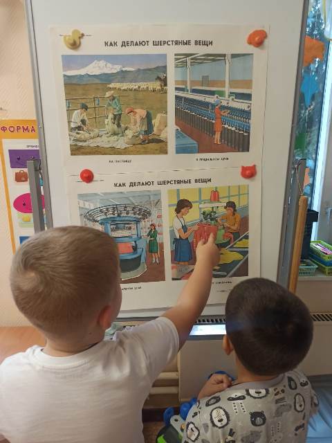 Шерстяные ткани не сильно пачкаются, самоочищаются на воздухе, почти не мнутся, могут самостоятельно разглаживаться. В одежде из шерсти кожа дышит. Дети побывали на пастбище, где увидели как пасут овец и как их стригут. Затем отправились на фабрику, где познакомились с получением шерстяных ниток и вязанием из них различных изделий. Закончилось путешествие в мини музее, где ребята увидели веретено и прялку и даже попробовали спрясть из куделя шерстяную нитку. Сидя в красном углу русской избы, дети создали замечательных шерстяных овечек. Нитка учит, забавляет и предоставляет возможность рукодельничать.