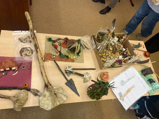 Учащиеся начальной школы вместе с пятиклассниками погрузились в историю первобытного общества. Они создали поделки: каменные орудия труда, луки со стрелами, макеты жилищ и стоянок, глиняную посуду. Кроме того, дети нарисовали сцены охоты на мамонтов и воспроизвели образцы пещерной живописи.