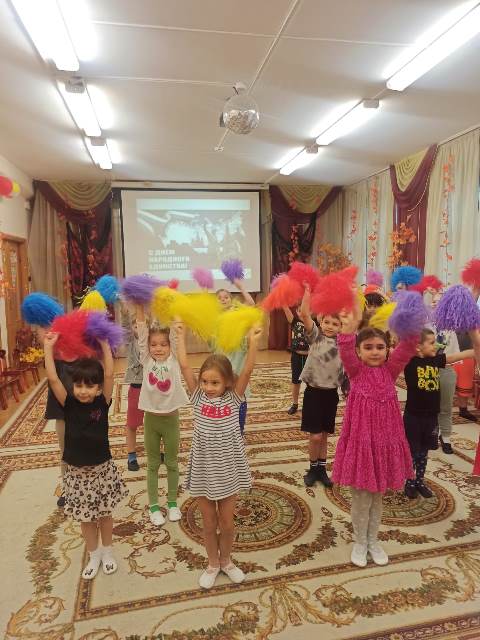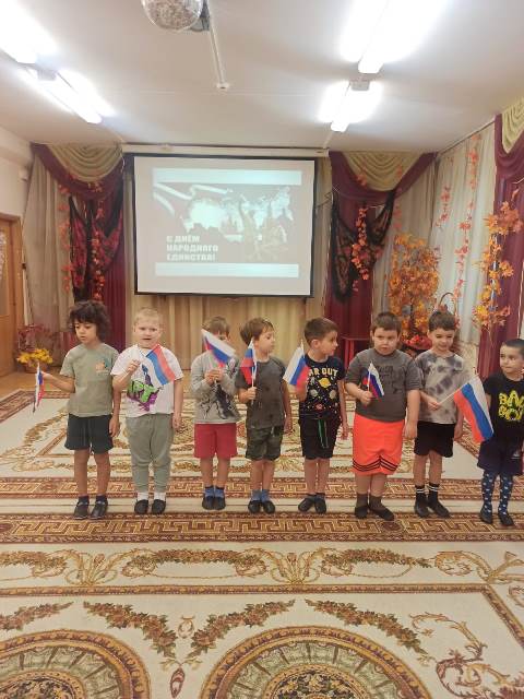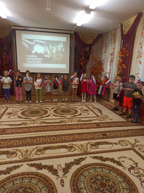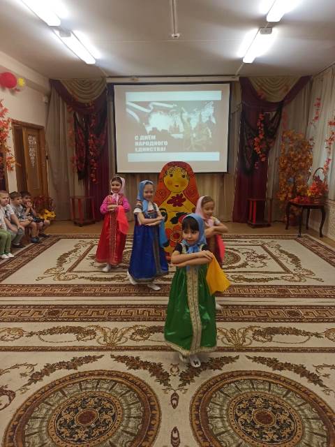 Это День народного единства, который отмечают 4 ноября. Этот праздник является символом уважения и гордости за великое прошлое нашего государства, даёт возможность осознавать себя нам единым народом с общей исторической судьбой и общим будущим. В группе "Пчёлка" ДО1 "Солнышко" прошёл досуг, посвящённый этой дате, на котором дети посмотрели презентацию о народах нашей большой страны, познакомились с историей возникновения праздника, подвигами наших предков во имя независимости Родины. С гордостью маршировали юные воспитанники, держа флаг России, а юные матрёшки кружились в танце в русских народных костюмах. Сила России в том, что люди разных национальностей живут в стране дружно, и все они одинаково любят свою Родину Россию.