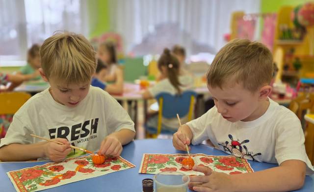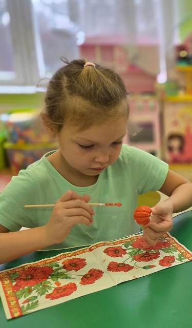 Ребята раскрашивали овощи из гипса гуашевыми красками, стараясь передать яркие цвета.
