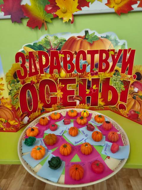 Вот и ребята группы "Веселинка" собрали урожай овощей. Это - тыквы, капуста, помидоры, перец, правда не настоящие, а из гипса. Эти замечательные фигурки стали основой для увлекательного творчества.