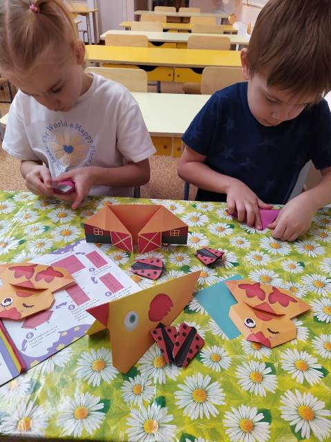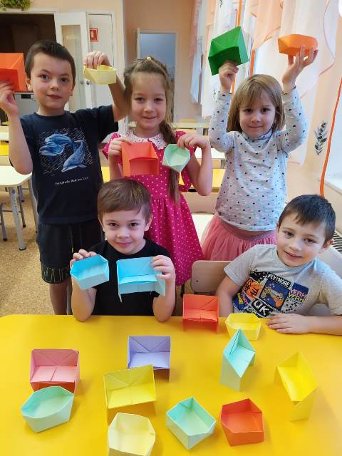 В этот раз ребята познакомились с древним восточным искусством - "Оригами", позволяющим создавать из простого бумажного листа, без ножниц и клея, всё, что угодно: не только известные всем пилотки, кораблики и самолеты, но и стаканчики с коробочками, зверей и птиц, цветы и жучков!