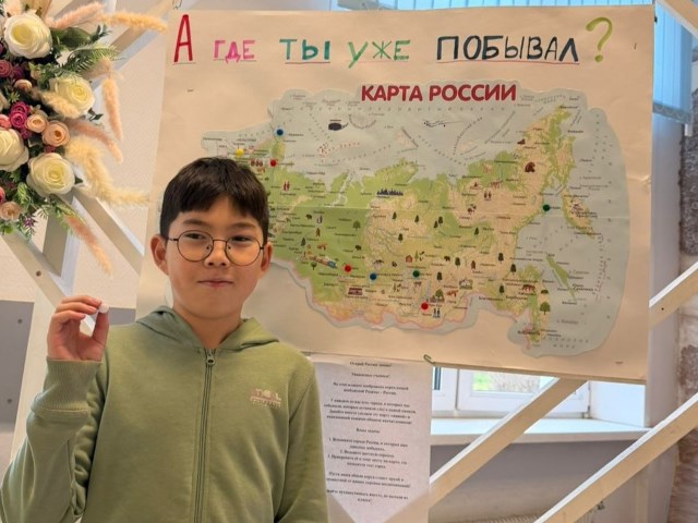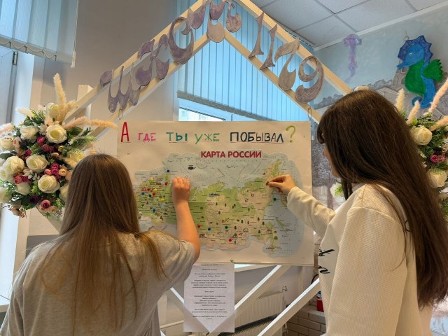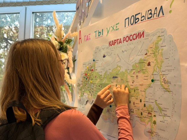 На большой карте России дети отмечали места, где они побывали. Кто-то указал свои любимые города, кто-то — деревни и села, где живут его родственники. Были отмечены и природные достопримечательности: горы, леса, реки и озёра.