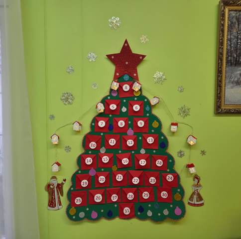 Ребята использовали творческий подход и фантазию. Сами выбирали краски, готовили и вырезали шаблоны для календаря. На каждое число декабря, приклеили карманы в которых спрятаны небольшие задания или пожелания.